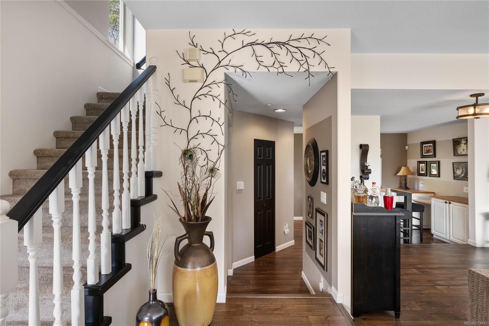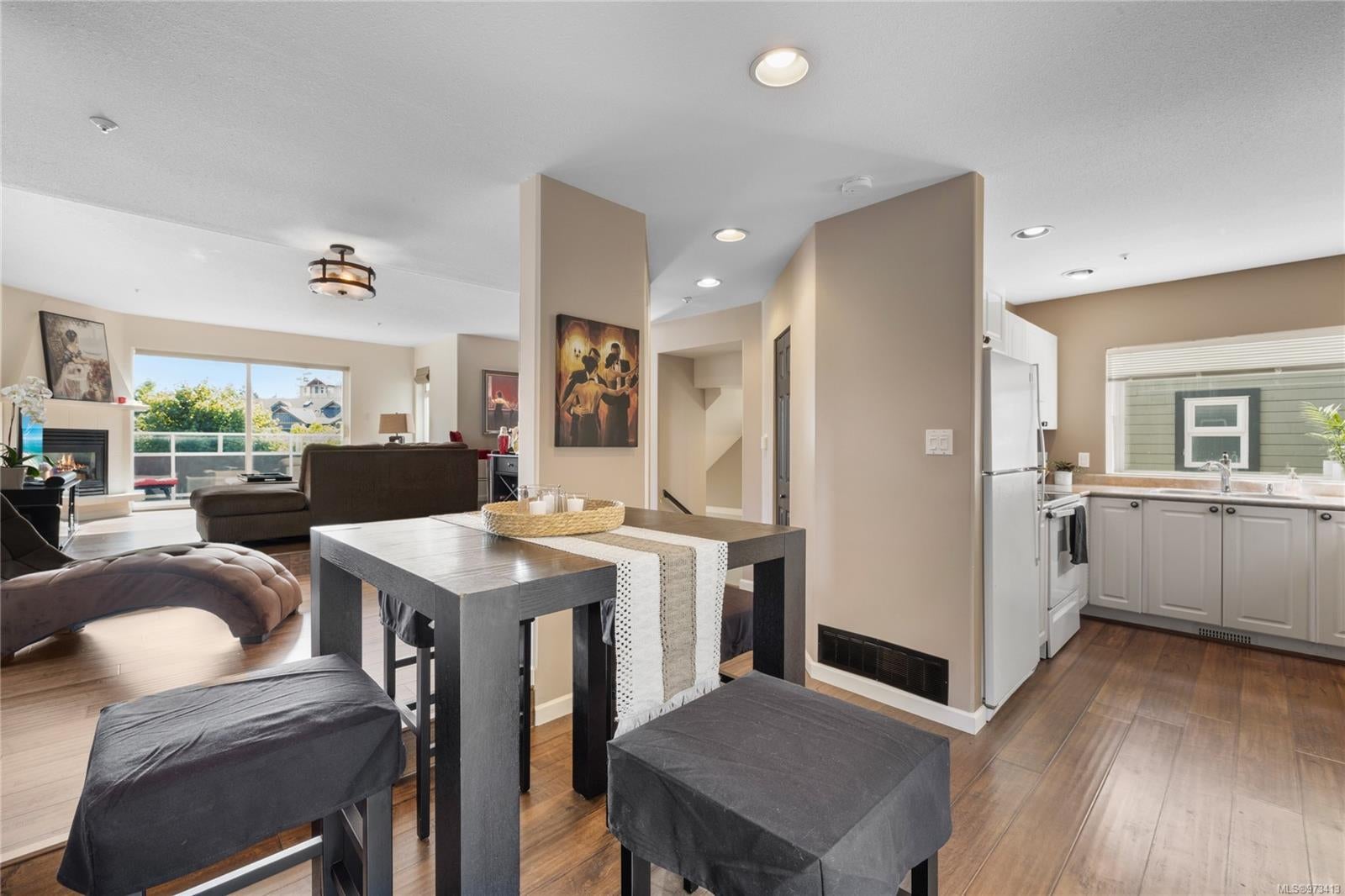 New Price! This 3-story 3Bd, 3bth townhome embodies contemporary elegance & comfort w/new flooring throughout. The main floor showcases a semi-open concept layout, ideal for entertaining or unwinding in style. The gas fireplace adds warmth to the living space & from here you can step onto the front deck, offering picturesque views of the tranquil pond and mature landscaping. Off the dining area is a deck at the rear of the home. Ascend to the third floor where you’ll find a large primary suite w/a renovated 3PC ensuite, boasting modern fixtures and luxurious finishes. On this floor there are 2 additional beds, providing space for family, guests, or a home office. Offering plenty of storage w/a single garage & a large storage/mechanical room at the back. Additional features include: new hot water tank, gas BBQ hookup, new dishwasher (2023). Pets allowed no age restrictions. Data & mas. Approx. Must be verified if important.
